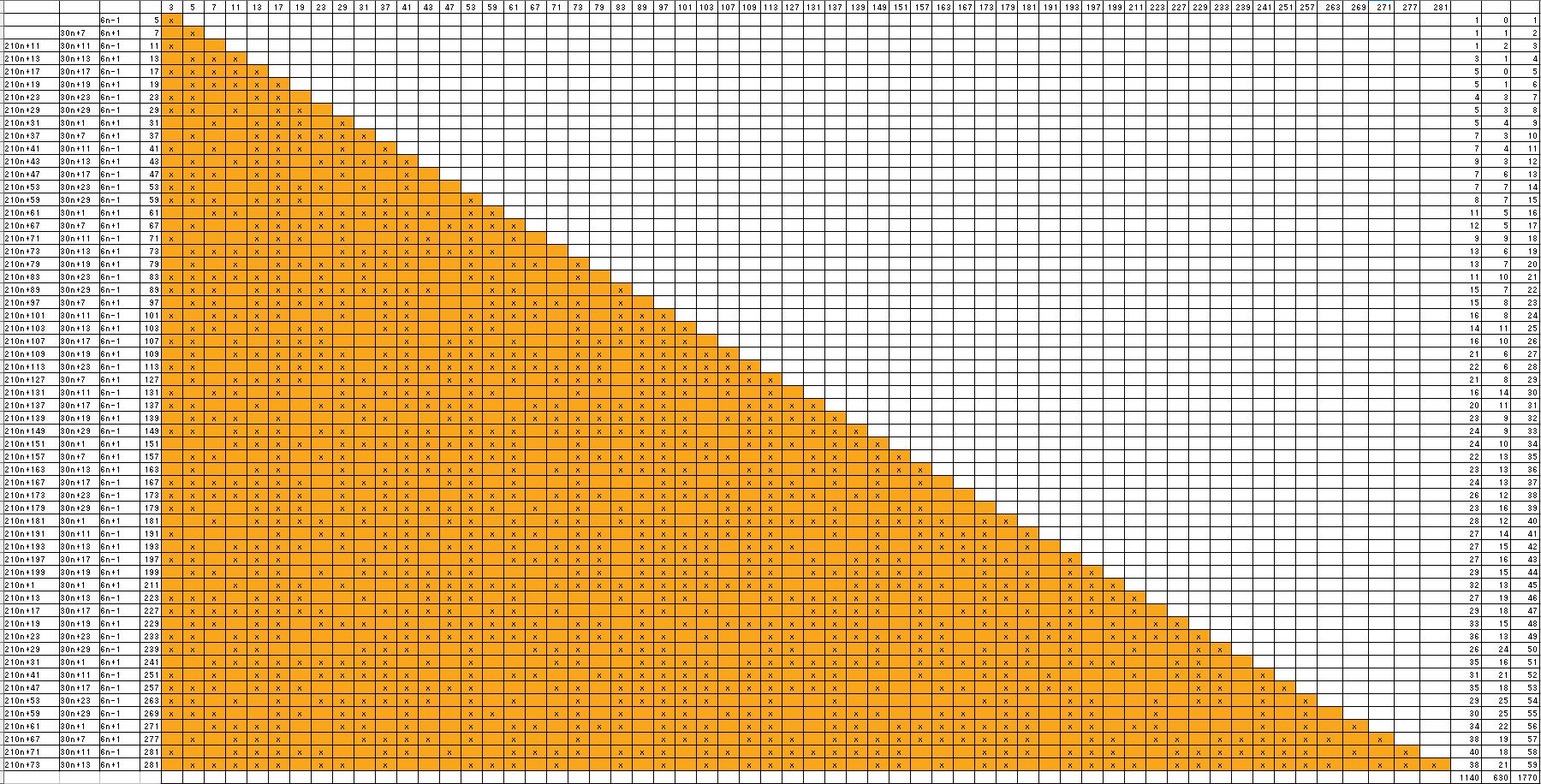 この表から、3はxが6n-1と表せる素数であるならば、決して現れないし、5は、xが30n+11,30n+13,30n+17,30n+23,30n+29