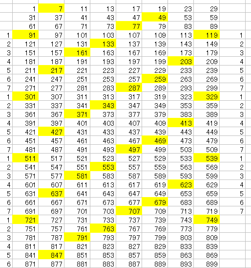 | 53(30x2-7) | 59(30X2-1) | 61(30X2+1) | 67(30X2+7) | 71(30X2+11) | 73(30X3+13) | 77(30X3-13) (7x11) |